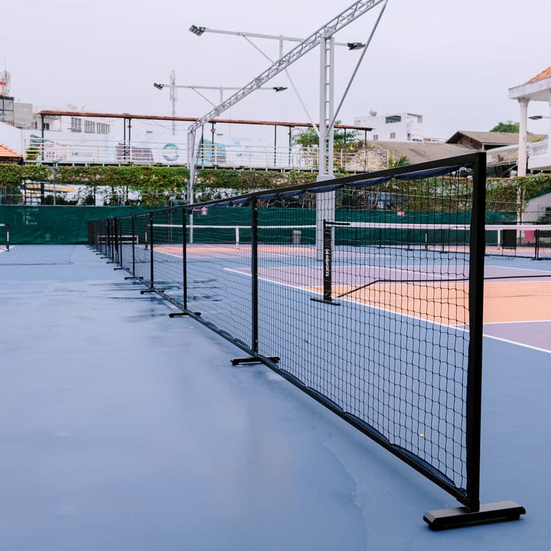 Barie sân Pickleball là hệ thống hàng rào di động hoặc cố định, thường được làm từ khung kim loại nhẹ kết hợp lưới chắn, vải PVC hoặc lưới polyester. Barie được đặt xung quanh hoặc giữa các sân pickleball nhằm phân tách khu vực thi đấu, hạn chế bóng bay sang sân khác và đảm bảo an toàn cho người chơi.